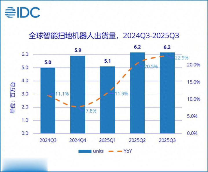 近日,IDC发布《全球智能家居设备市场季度跟踪报告,2025年第三季度》。报告数据显示,2025年前三季度,全球智能扫地机器人市场累计出货量达1742.4万台,同比增长18.7%,行业增长势头强劲。
