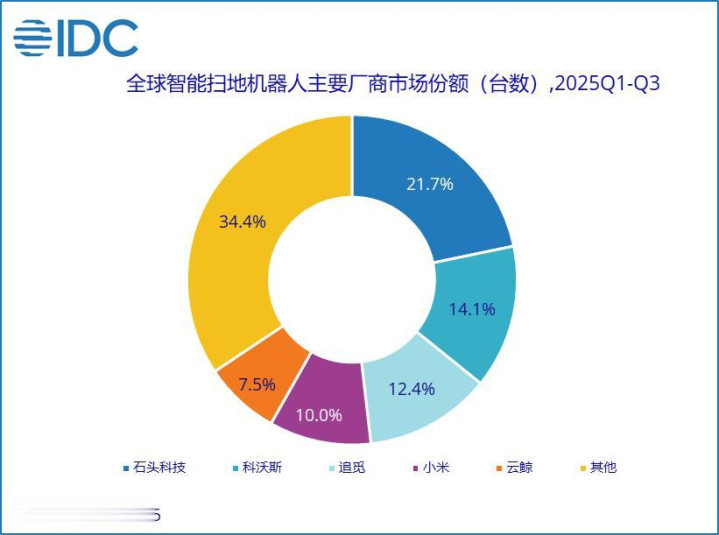 市场表现: 2025年前三季度,石头科技累计出货378.8万台,以21.7% 的市场份额强势登顶全球第一,领先优势显著。